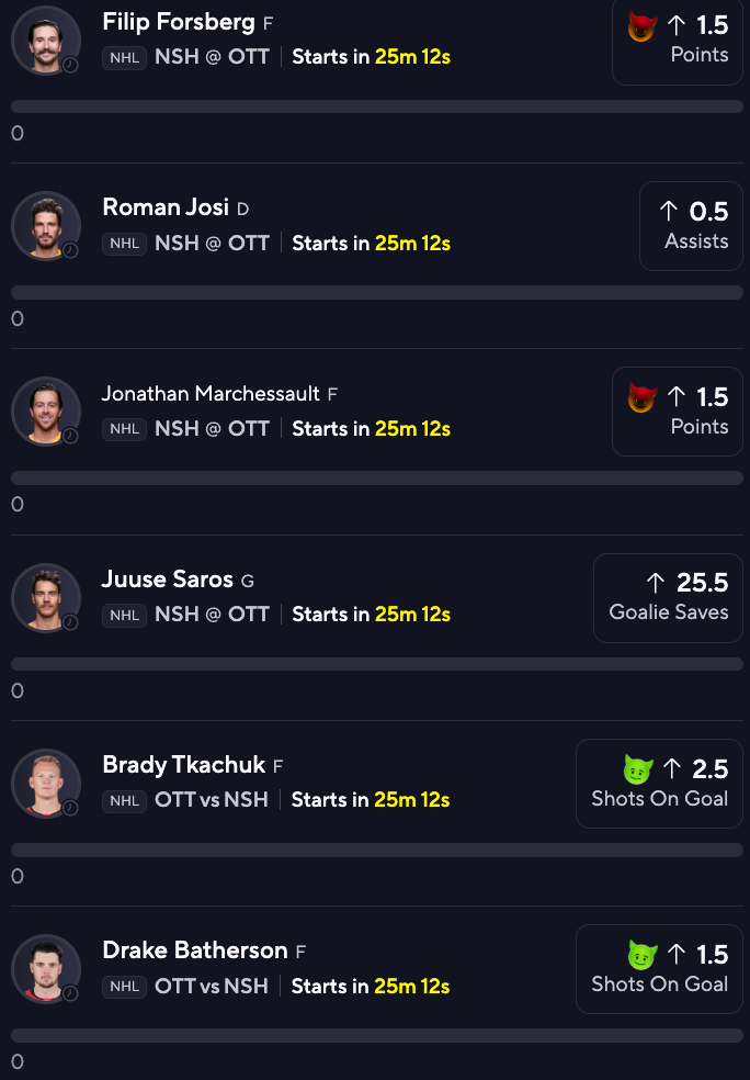 PrizePicks Lineup for tonight's Ottawa at Nashville Matchup!